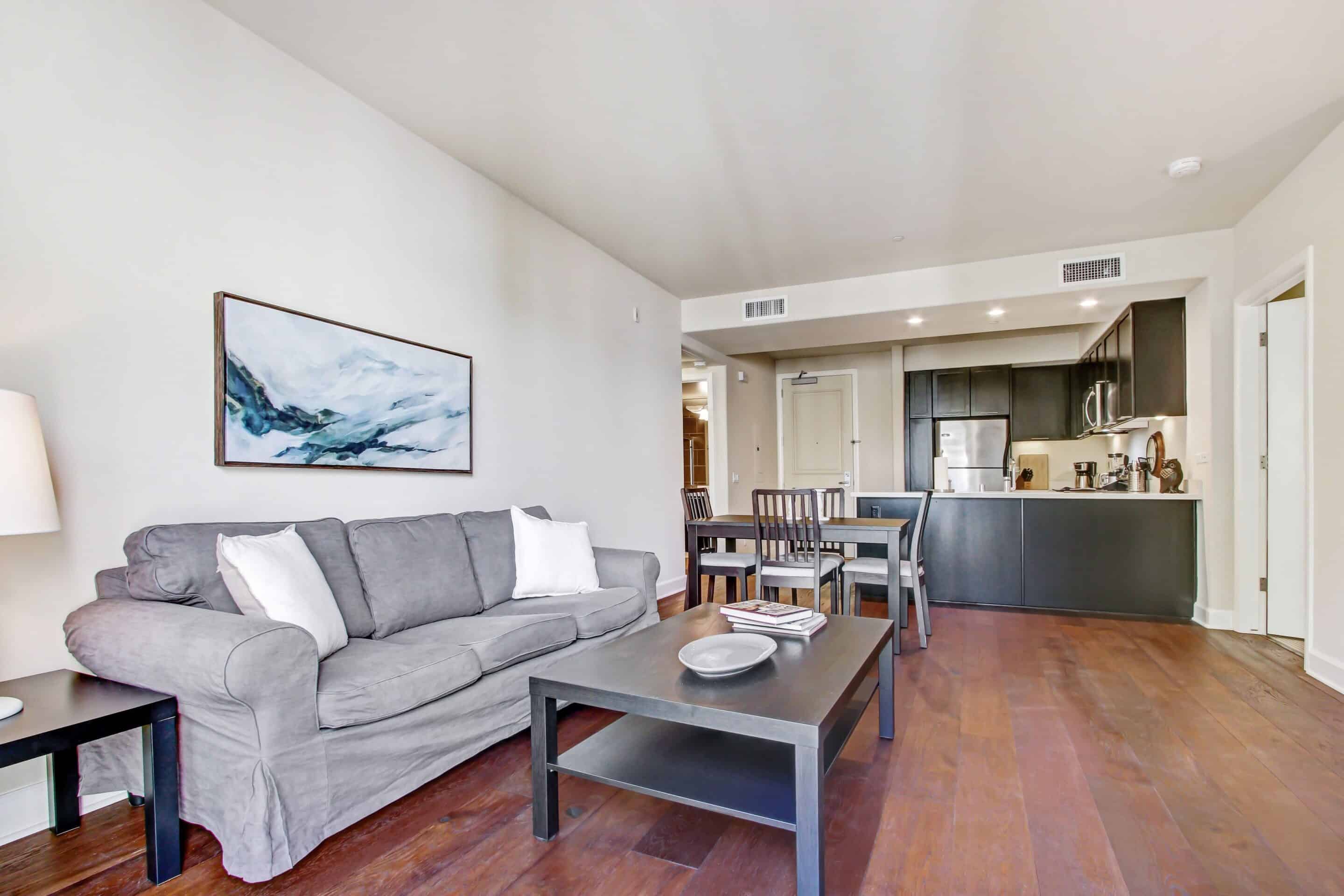 Features include hardwood flooring, fully equipped kitchen with stainless steel appliances, Corian counters, walk in closets, 2 full baths both en suite with tub/shower enclosure. HDTV- flat screen TV’s with streaming in living room+ guest + primary bedroom. Centralized A/C and heat+ washer-dryer in suite+ 2 secure tandem garage parking spaces. Amenities include valet parking available for guests, resident concierge, gorgeous resort style pool/spa, cutting edge fitness center, clubhouse, rooftop garden, gated entrance/controlled access, Amazon lockers, car charging stations and more!